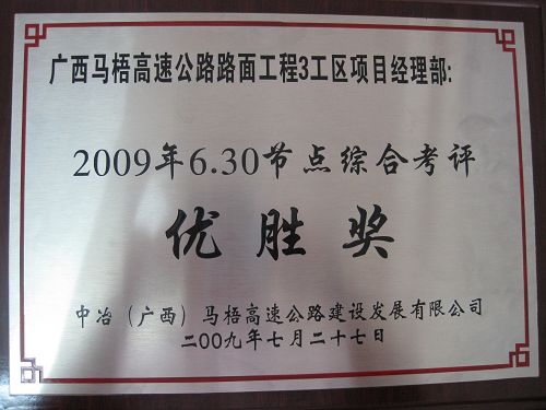 十七冶路桥公司广西马梧路面项目部认真践行十七冶企业文化核心理念,坚持“效率第一,用未来思考今天”的核心价值观。继今年“4.30”劳动竞赛中获一等奖之后再传捷报:在业主和总监办4-6月份质量、进度、安全、内业资料等方面的“6.30”节点综合考评中又喜获优胜奖。