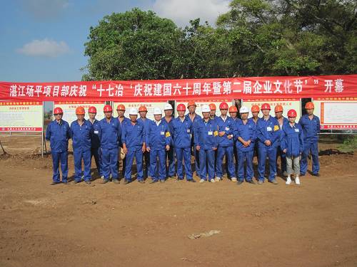 为迎接十七冶“庆祝建国六十周年暨第二届企业文化节”开幕式的到来,凝聚战斗力,鼓舞士气,8月28日上午8点58分,十七冶湛江钢铁场地平整四标项目部与总公司同步,在战斗一线举行了一场特殊而有意义的庆祝仪式。项目部全体成员通过这样一个简短的仪式来“庆祝建国六十周年暨第二届企业文化节”的开幕。