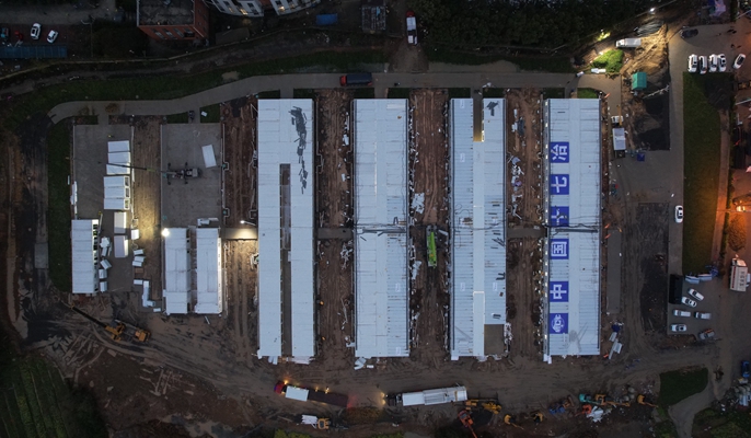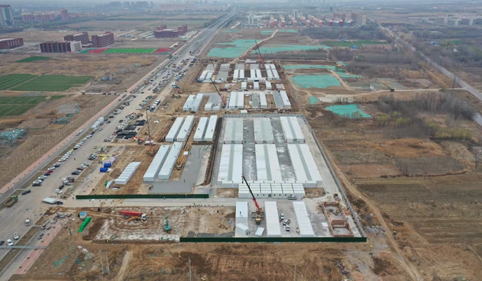 建筑分公司正加快推进山东惠民县防疫设施,6台大小挖机,1台顶管机、150余名施工人员正在紧张作业中。截至22日,A、B区隔离间已交付使用,C、G区板房安装完成,F、H区板房安装均完成95%。
