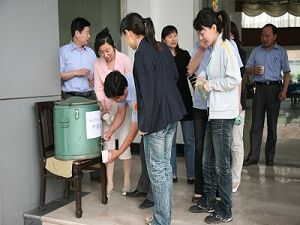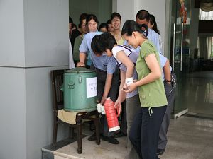 525日上午,公司爱卫会组织总部大楼300名员工在食堂门前饮用预防甲型H1N1流感中药汤。这是公司爱卫会开展的为期5天的中药预防措施,体现出公司对员工的深情关爱。