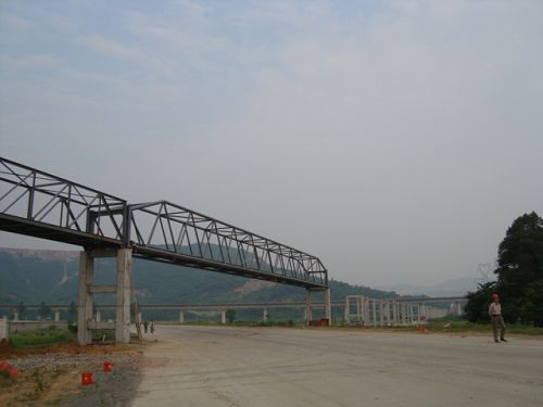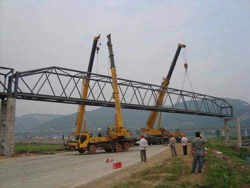 次跨钢桁架跨度55.5m,为钢管构件,重量约53t,两端为砼支架,跨越沿新公路,吊装难度较大。此段廊道跨越已经通车的公路且车流量较大,在吊装前由交通管理部门,在道路两端设置告示牌,并由交警部门进行交通管制,道路全封闭,为确保成功吊装,该项目部优化施工方案,采用一台70t、两台25t抬吊,相互配合,确保了该钢桁架一次就位成功。