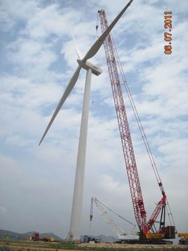 76中午12时,由风力与太阳能发电工程技术公司承建的青岛隆鑫一期风电场首台风机成功吊装完成,拉开了工程施工大干高潮的序幕。