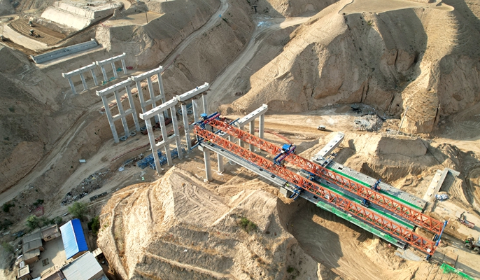连霍高速庙儿沟大桥首片箱梁架设