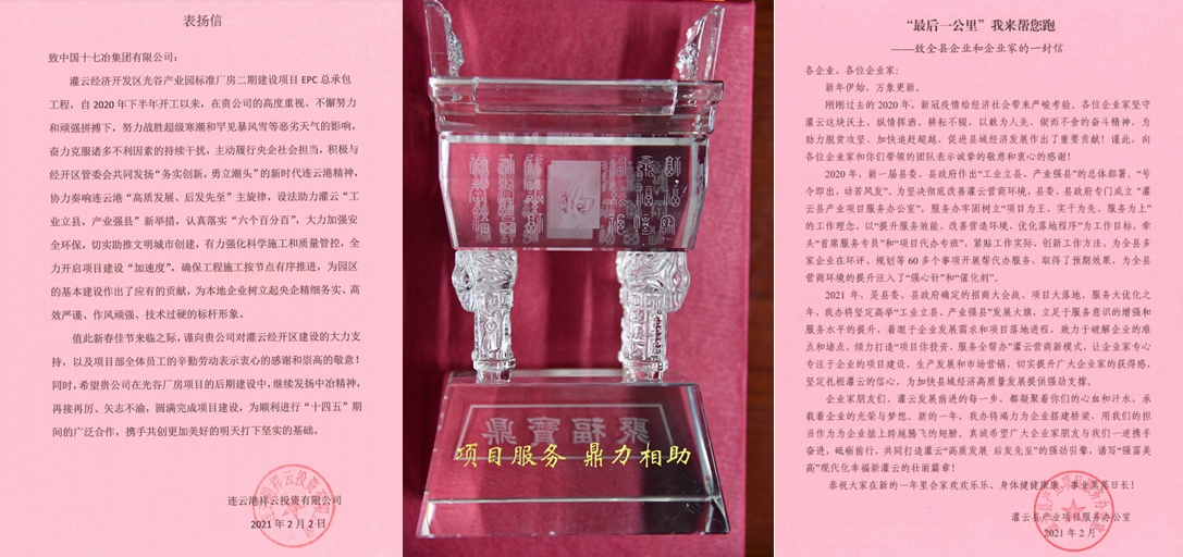 表扬信和感谢信中称,该项目自2020年下半年开工以来,在十七冶的高度重视、不懈努力和顽强拼搏下,努力战胜超级寒潮和罕见暴风雪等恶劣天气的影响,奋力克服诸多不利因素的持续干扰,主动履行央企社会担当,积极与经开区管委会共同发扬“务实创新,勇立潮头”的新时代连云港精神,协力奏响连云港“高质发展、后发先至”主旋律,设法助力灌云“工业立县,产业强县”新举措,认真落实“六个百分百”,大力加强安全环保,切实助推文明城市创建,有力强化科学施工和质量管控,全力开启项目建设“加速度”,确保工程施工按节点有序推进,充分展现出耕耘不辍、锲而不舍的奋斗精神,为园区的基本建设作出了应有的贡献,为助力脱贫攻坚、加快追赶超越、促进县域经济发展作出了重要贡献,为本地企业树立起央企精细务实、高效严谨、作风顽强、技术过硬的标杆形象。