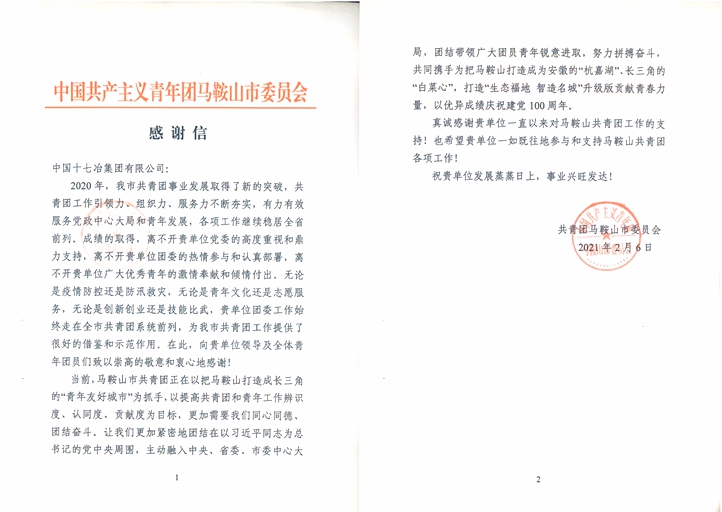 共青团马鞍山市委副书记胡宏扬到十七冶调研并致感谢信