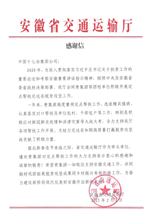 2月1日,安徽省交通运输厅向中国十七冶集团致感谢信,对公司大力支持交运厅各项扶贫工作,助力定远县如期高质量打赢脱贫攻坚战贡献积极力量表示感谢,对公司在脱贫攻坚工作中取得的成绩给予了肯定和赞扬。