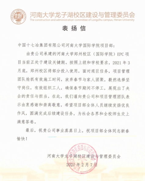2月7日,河南大学龙子湖校区建设与管理委员会向中国十七冶集团河南大学项目部致表扬信,对河南大学项目部为校区建设所做出的牺牲与努力表示由衷的感谢和崇高的敬意。