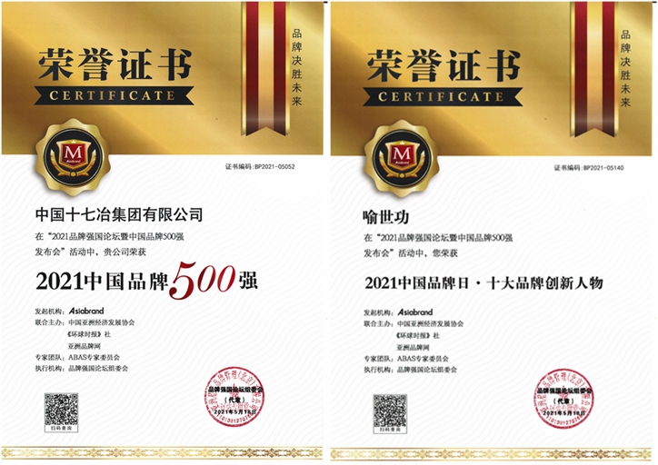 6月1日,中国十七冶集团收到“2021中国品牌500强”荣誉证书,位居榜单第155位,公司董事长、党委书记喻世功荣获“2021十大品牌创新人物”。