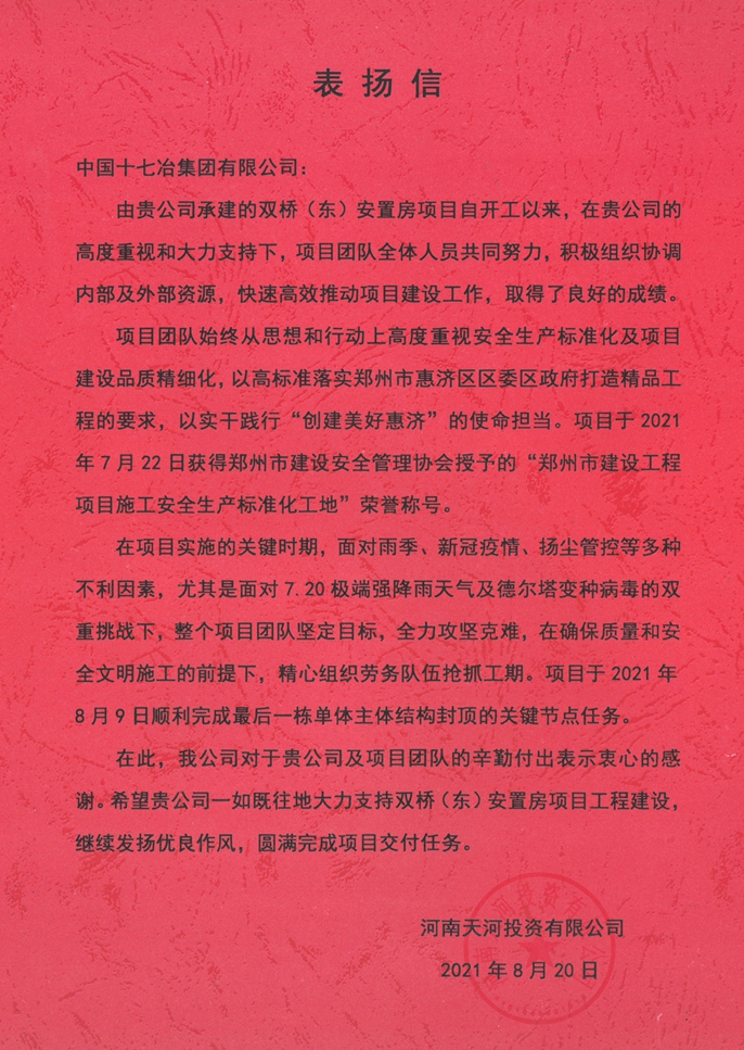 表扬信指出,双桥(东)安置房项目团队始终从思想和行动上高度重视安全标准化及项目建设品质精细化,以高标准落实郑州市惠济区委区政府打造精品工程的要求,以实干践行“创建美好惠济”的使命担当。在项目实施的关键时期,面对雨季、新冠疫情、扬尘管控等各种不利因素,尤其是面对7.20极端天气及德尔塔变种病毒的双重挑战下,整个项目团队目标坚定,全力攻坚克难,在确保质量和安全文明施工的前提下,精心组织劳务队伍抢抓工期,项目于2021年8月9日顺利完成最后一栋单体主体结构封顶的关键节点任务,取得了突破性成绩,希望十七冶继续发扬优良作风,圆满完成项目交付任务。