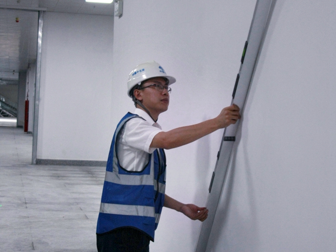 孙则树同志在南阳市火车站广场项目进行室内装饰墙面平整度检查