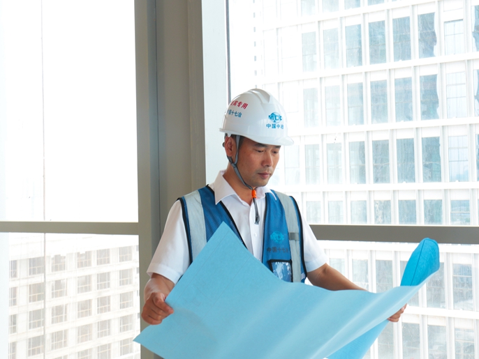 丁守明在对照图纸检查项目建设情况