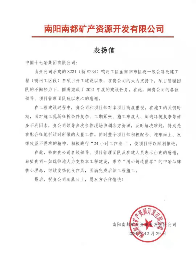 12月29日,南阳南都矿产资源开发有限公司向中国十七冶集团致表扬信,对中国十七冶集团路桥工程技术分公司承建的S231(新 S234)鸭河工区至南阳市区段一级公路改建工程(鸭河工区段)项目部圆满完成2021年度建设任务提出表扬并表示感谢。