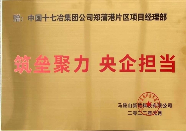 1月11日,马鞍山新地科技有限公司将写有“筑垒聚力 央企担当”的荣誉牌颁发给中国十七冶集团郑蒲港片区项目,对项目部保质保量如期交付中兴新地(马鞍山)产业园工程表示深深感谢。