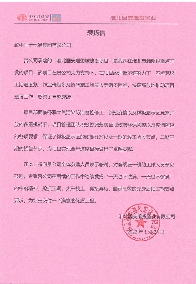 淮北国安濉投置业有限公司向十七冶致表扬信