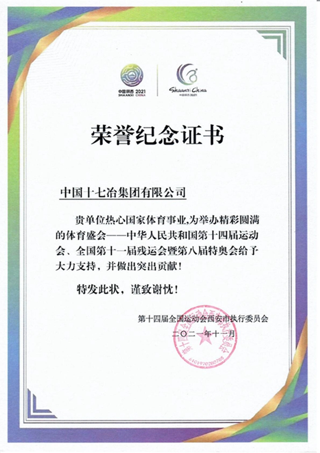 3月4日,中国十七冶集团有限公司收到了由第十四届全国运动会西安市执行委员会颁发的荣誉纪念证书,对公司热心国家体育事业,为举办精彩圆满的体育盛会——中华人民共和国第十四届运动会、全国第十一届残运会暨第八届特奥会给予大力支持、做出突出贡献表示高度肯定和诚挚感谢。