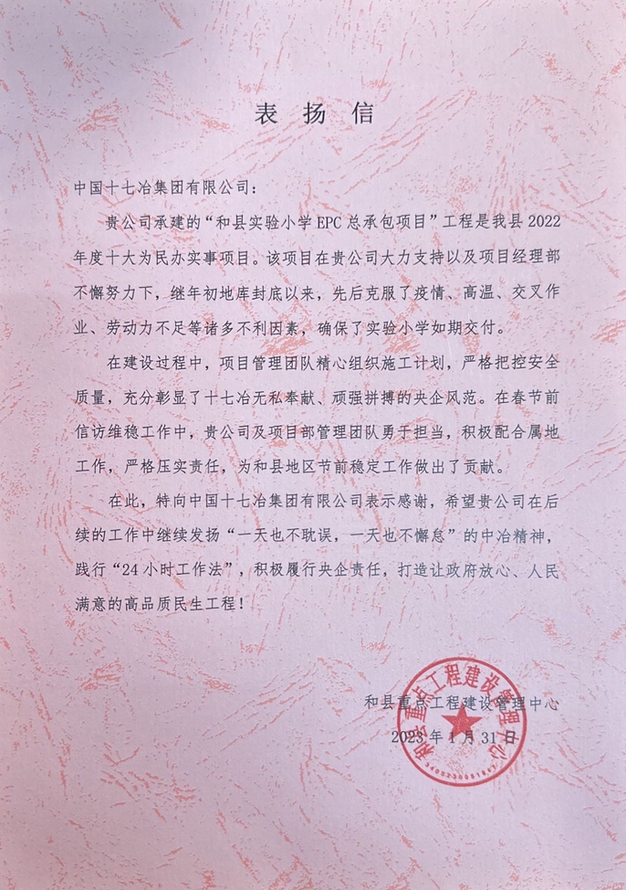 近日,和县重点工程建设管理中心向中国十七冶集团致表扬信,对市政分公司和县实验小学项目团队为确保项目如期交付所作努力给予充分肯定并致以衷心感谢。