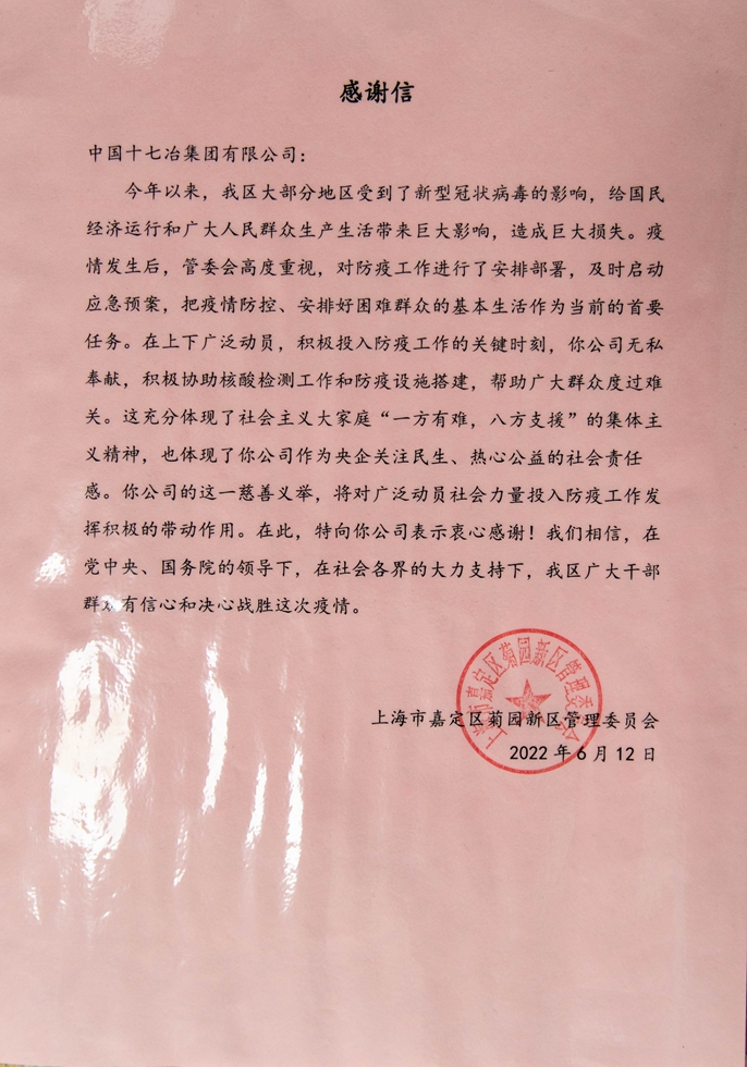 6月22日,中国十七冶集团收到嘉定区菊园新区管委会的感谢信,信中对上海分公司菊园共有产权房项目部在属地疫情防控、防疫物资和生活物资的转运提供的多次援助表示衷心的感谢。