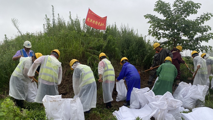 接到丰乐镇政府动员通知后,当日下午3点,项目立即组织40多名项目管理、作业人员,冒雨前往丰乐河大坝装沙袋、筑堤坝,仅2小时便完成了丰乐河铁路段400米长堤坝的加高加固工程,为沿河低洼地段建起一道安全屏障,有效保护群众生命财产安全,用实际行动彰显了十七冶的责任与担当。